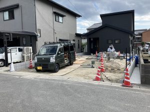 右側に見えるコンクリートブロックの土留め擁壁と大量の土を使って駐車場となるスペースをかさ上げで高くすることで水勾配を設けます。