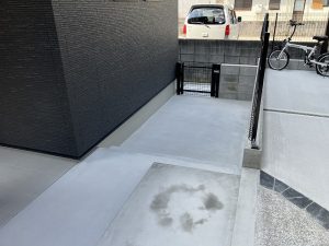 道路側から家に向かって低くなる傾斜のある敷地が特徴の三原市K様邸の新築外構施工例です。