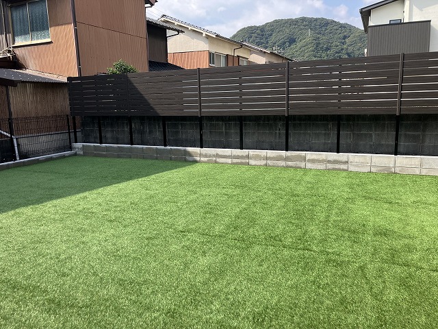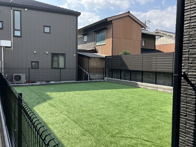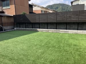 人気の人工芝のゆったり空間。三平は下地調整までを行い人工芝を貼られたのはK様。とってもキレイな仕上がりです(^^)/