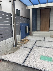 門柱が横向き!ユニソン宅配ポストVico+3台分カーポートの新築外構施工例