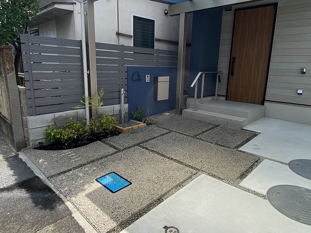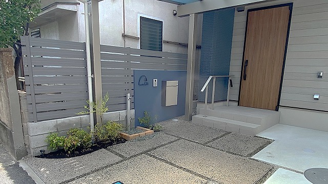 「門柱もインターフォンも宅配ポストも、照明も欲しい!」とのご要望に対して壁を造ってしまうと動線やデザインの可能性を様々な制約が縛ってしまうことに配慮し建物外壁の色に合わせたブルーの塗り壁門柱を横向きに配しました。お隣からの視線を遮る目隠しフェンス「マイティウッド」を被せて高さも十分。