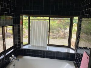 照明の奥には寒さ対策に取り付けたバスヒーターも見えています。お住まいのある三原市大和町の冬は寒いのでこれで浴室もあたたかい空間に。洗濯物の室内干しでも活躍します。