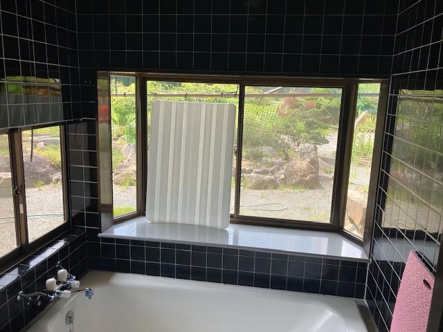 小さな窓ひとつにして壁は「バスパネル」という内装材でカバー。 浴槽のまわりもバスパネルでタイルを隠すように施工しました。