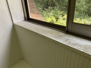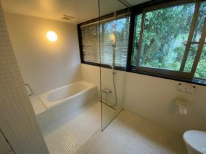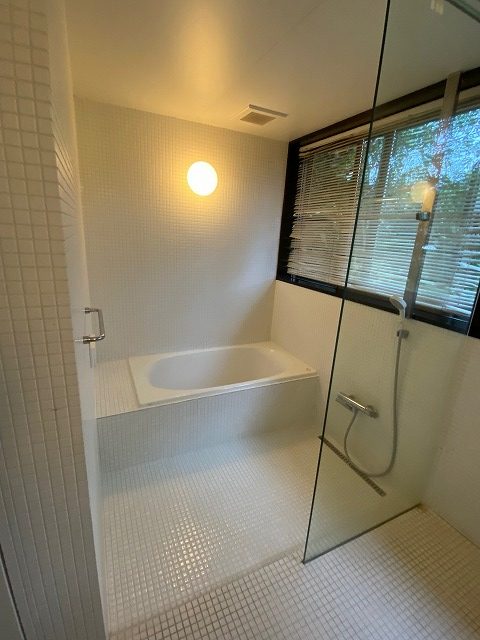 ヒビ浴槽とタイルのお風呂を外構のプロが職人技リフォーム!窓の額縁はこげ茶でキリっと