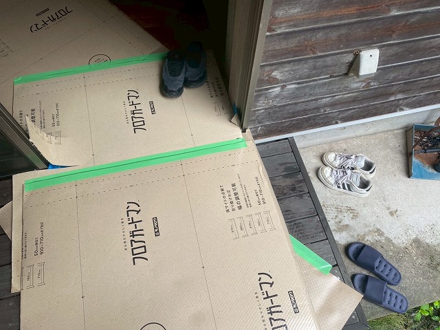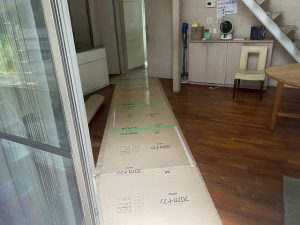 通路確保のためリビングや出入口の養生をしっかりと。