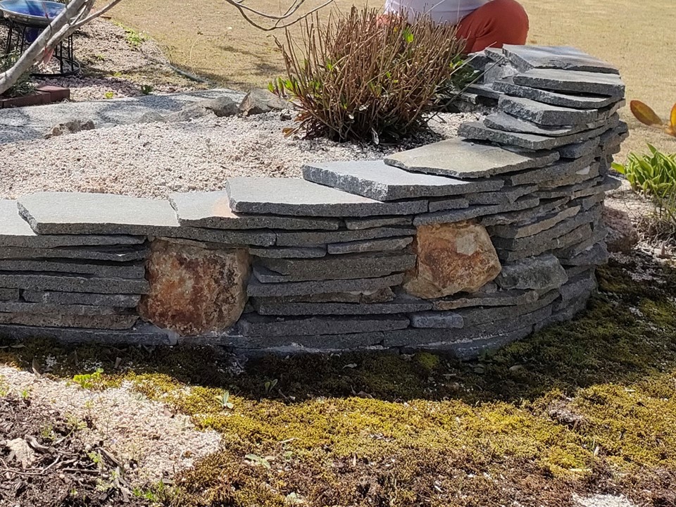 F様から「自然過ぎるのはちょっと…」というご要望もあり面はキレイに揃えながらの職人仕事。自然の石の風合いが生きるオシャレな花壇に仕上げました。鉄平石の隙間にアクセントとして埋め込んだ大きめのグリ石も効いています。