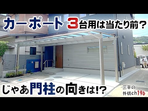 尾道市N様邸の新築外構施工例の解説!3台用の駐車スペースに門回りを併用させたアイデア外構です。カーポートは3台用を設置。横向きに配した門柱にはお隣からの視線を遮る目隠しフェンス「マイティウッド」を被せて高さも十分。表札、ユニソン宅配ポスト「VicoDB」インターフォンも併設した門柱の塗り壁は外壁のブルーに揃えています。手前には立水栓、そのまた手前にはシロナンテンをメインとした植え込み。コンクリート洗い出しのアプローチが3台目の駐車スペースを兼ねています。